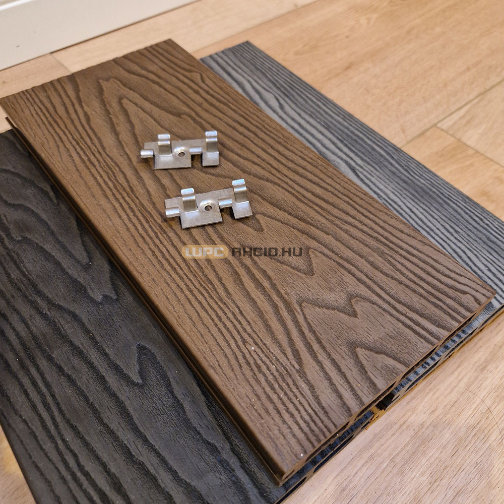 1 nm2 Prémium WPC teraszburkolat csokibarna színben, fém klipszes kivitelben. A Prémim WPC burkolat rendszer ára tartalmazza az 1 nm2 burkoláshoz szükséges WPC deszkákat, a párnafát, a fém rögzítő klipszeket, az indító/ záró klipszet és az ezek rögzítéséhez szükséges csavarokat.