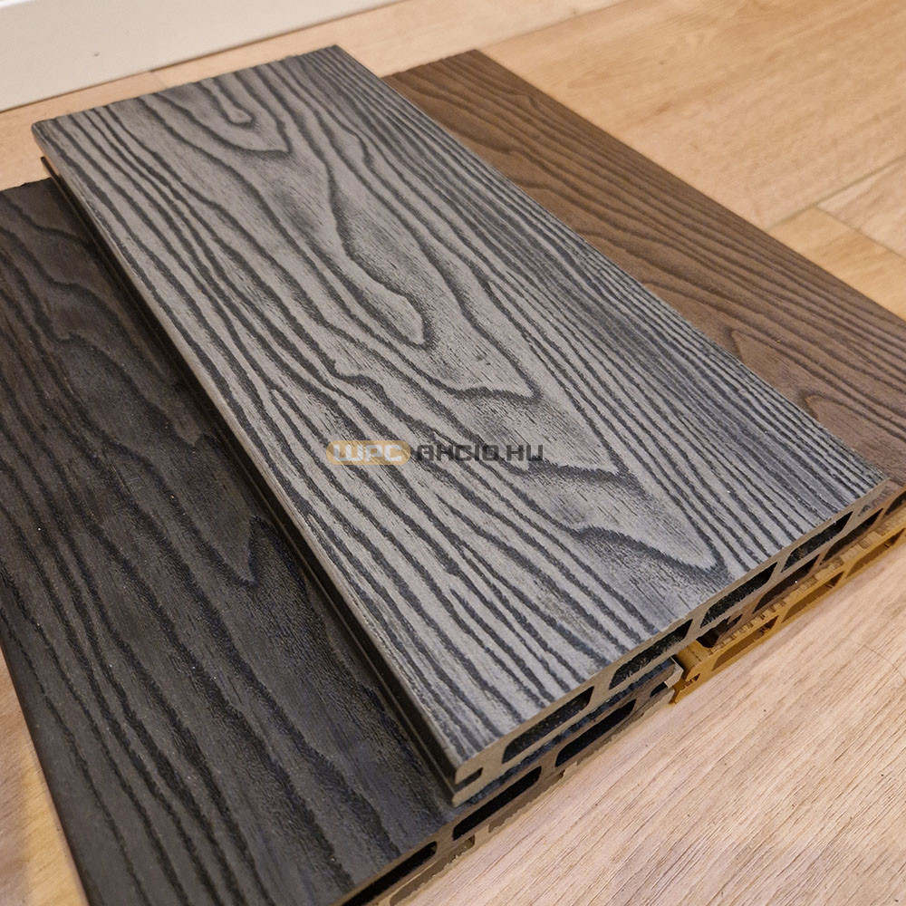 Prémium WPC teraszburkolat világos antracit színben, 2900x140x23mm. A Prémium WPC burkolat mind a két oldalával felfelé rakható, egyik oldala faerezetes mintájú, a másik oldala sűrűn bordázott. A Prémium WPC burkolat tökéletes választás szállodai és éttermi teraszok, járdák és medence partok burkolására. A faerezetes, Prémium WPC burkolat 5 különböző színben kapható.