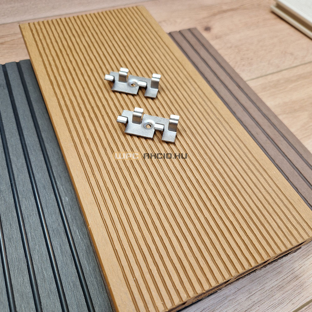 1 nm2 Standard WPC teraszburkolat natúr tölgy színben, fém klipszes kivitelben. A Standard WPC burkolat rendszerára tartalmazza az 1 nm2 burkoláshoz szükséges WPC deszkákat, a párnafát, a fém rögzítő klipszeket, az indító/ záró klipszet és az ezek rögzítéséhez szükséges csavarokat.
