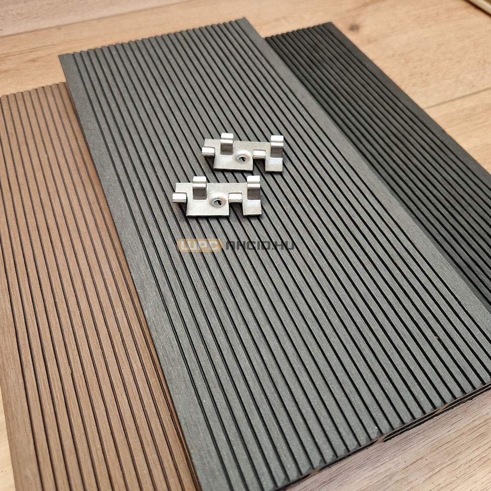 1 nm2 Standard WPC teraszburkolat világos antracit színben, fém klipszes kivitelben. A Standard WPC burkolat rendszerára tartalmazza az 1 nm2 burkoláshoz szükséges WPC deszkákat, a párnafát, a fém rögzítő klipszeket, az indító/ záró klipszet és az ezek rögzítéséhez szükséges csavarokat.