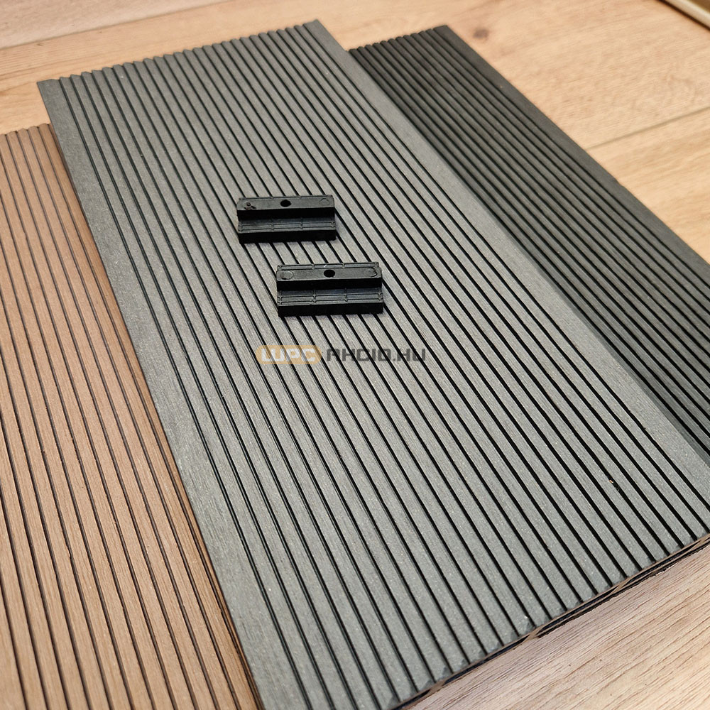 1 nm2 Standard WPC teraszburkolat világos antracit színben, műanyag klipszes kivitelben. A Standard WPC burkolat rendszerára tartalmazza az 1 nm2 burkoláshoz szükséges WPC deszkákat, a párnafát, a műanyag rögzítő klipszeket, az indító/ záró klipszet és az ezek rögzítéséhez szükséges csavarokat.
